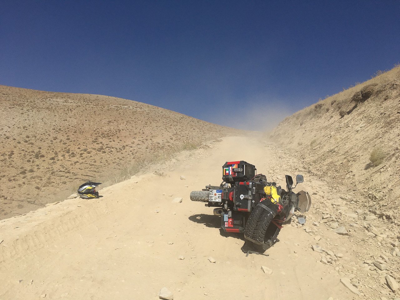 Am steilen Berg auf einer Staubpiste konnte ich einen kleinen Sturz nicht mehr verhindern.