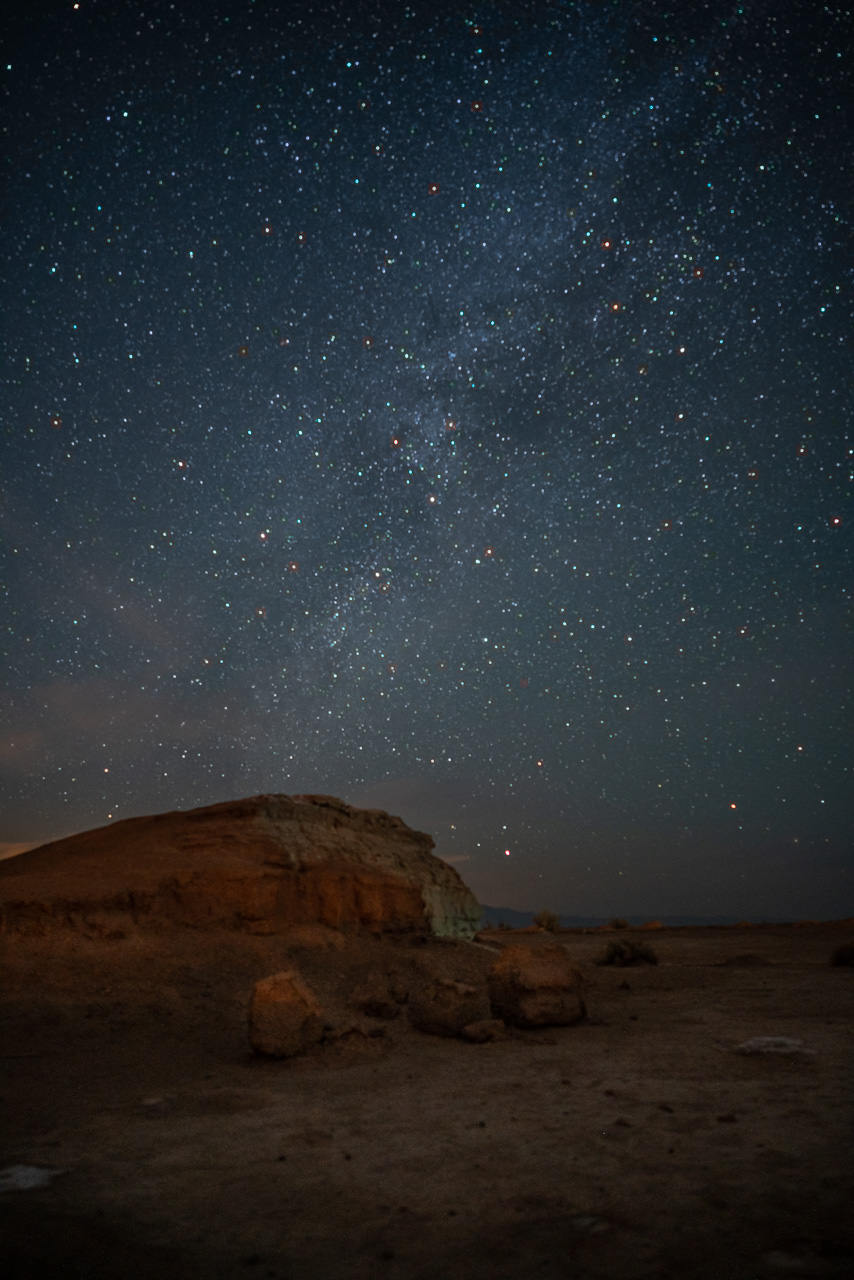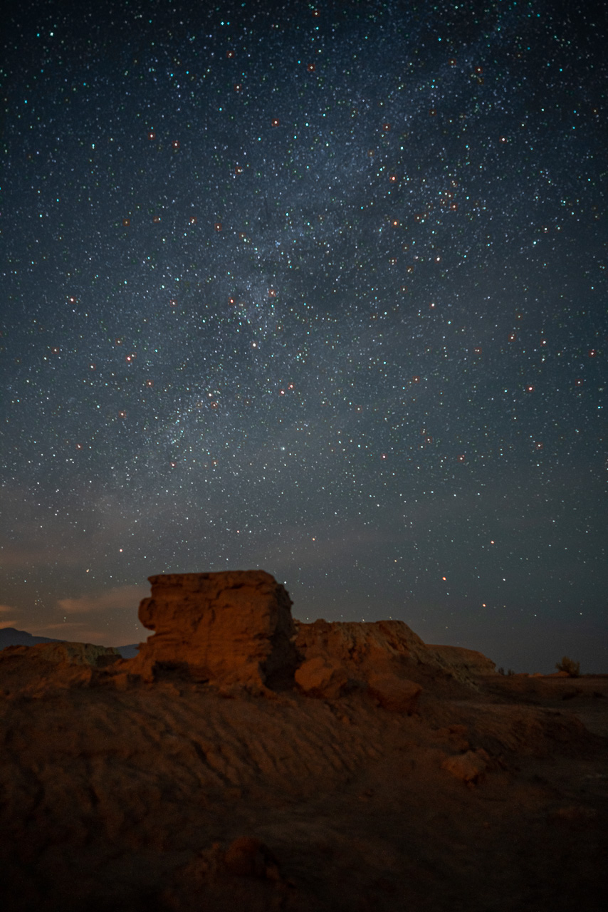 Da es in der Nähe der Eco Lodge auch einige Bäume und Sträucher in der Wüste gibt, nutze ich diese als Vordergrund. Im Licht meiner Taschenlampe entdecke ich, dass die meisten der seltsamen Erdhügel ein Loch in der Mitte haben, was wohl bedeutet, dass sie ursprünglich einmal Schlammvulkane gewesen sein müssen.